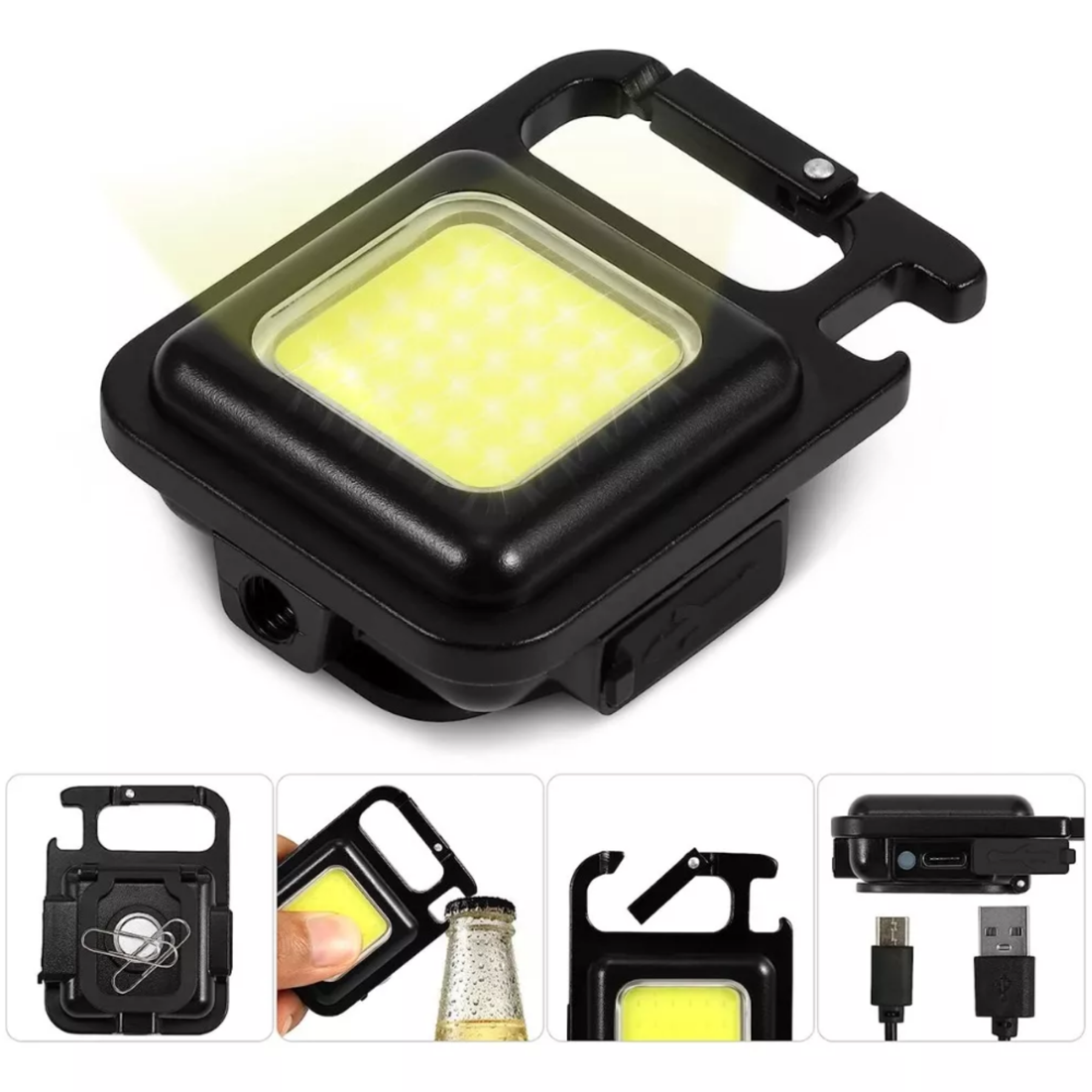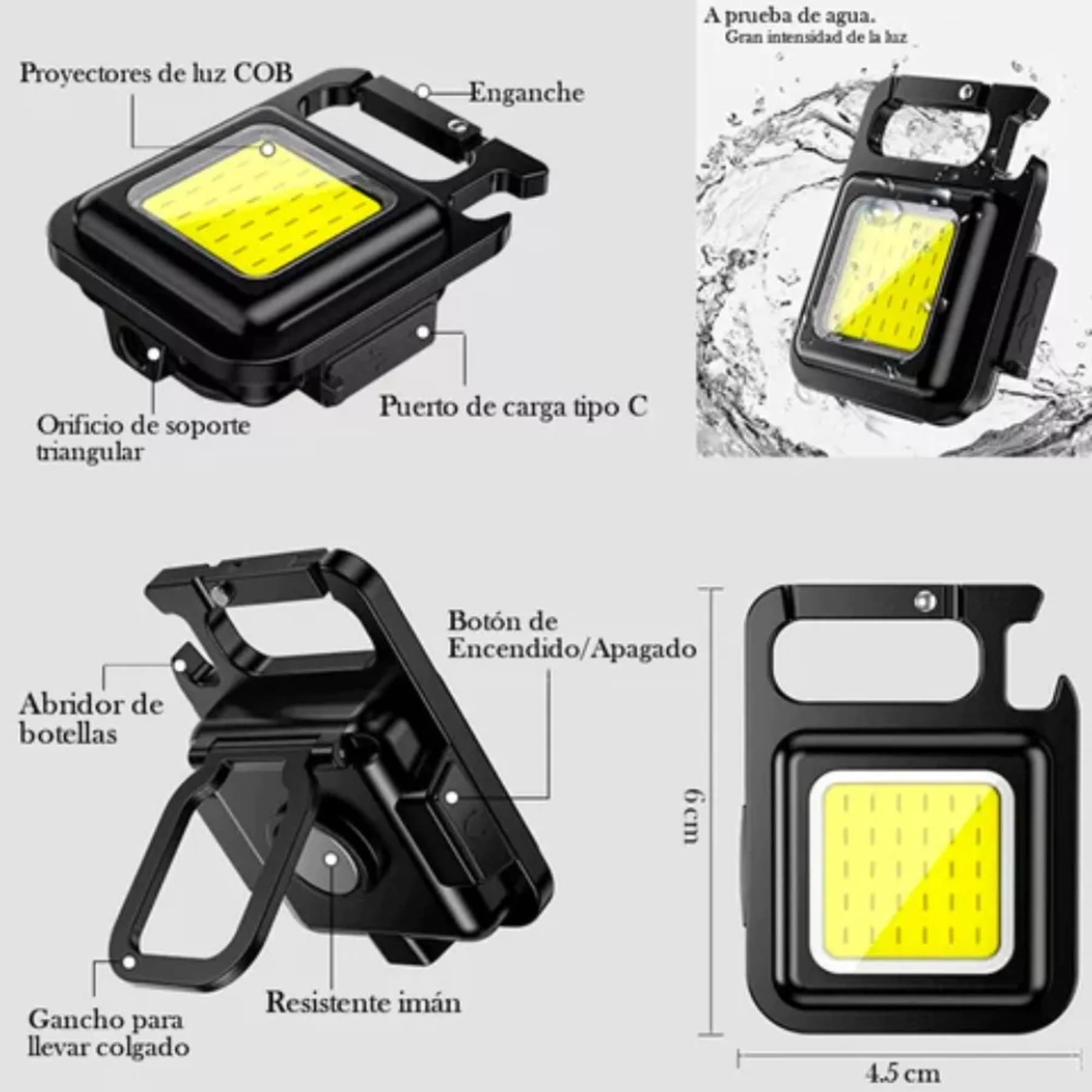 Diseño Práctico: Incluye un mosquetón para colgarla en tu llavero o mochila 🎒, es resistente al agua (IP44) y a los impactos. Además, su diseño magnético permite fijarla a cualquier superficie metálica, y su mango plegable de 180° ofrece múltiples ángulos de iluminación. 🔄